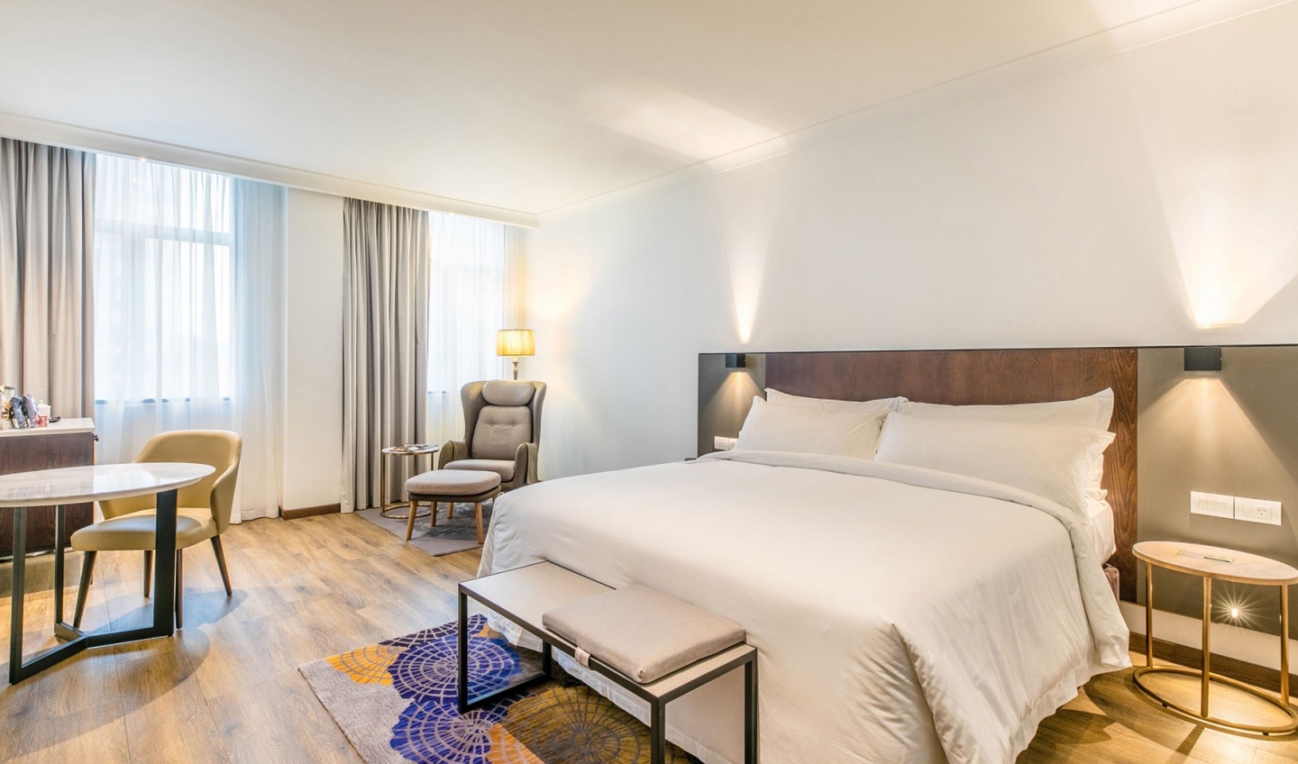 klimatizace, možnost připojení k internetu, minibar, žehlička a žehlící prkno, vysoušeč vlasů, TV, trezor