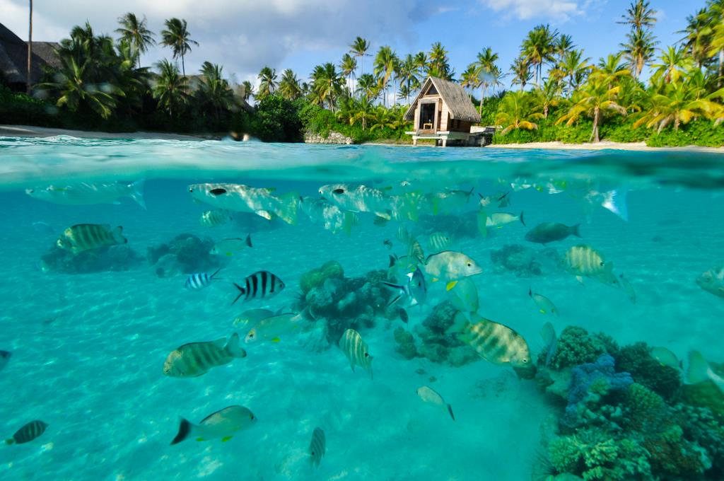 privátní hotelová pláž s bílým korálovým pískem – koupání v laguně i v oceánu
