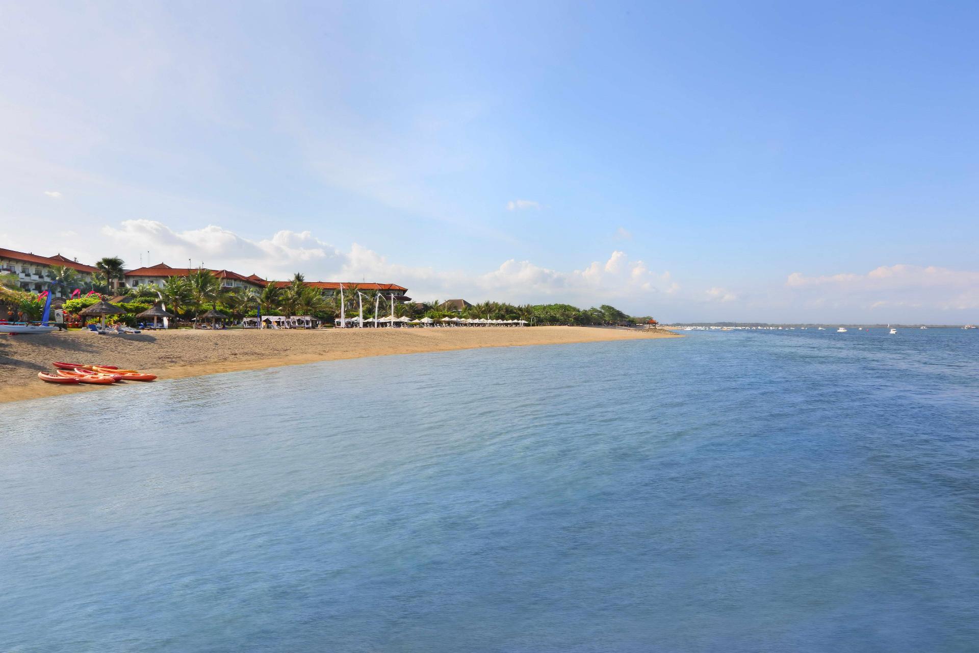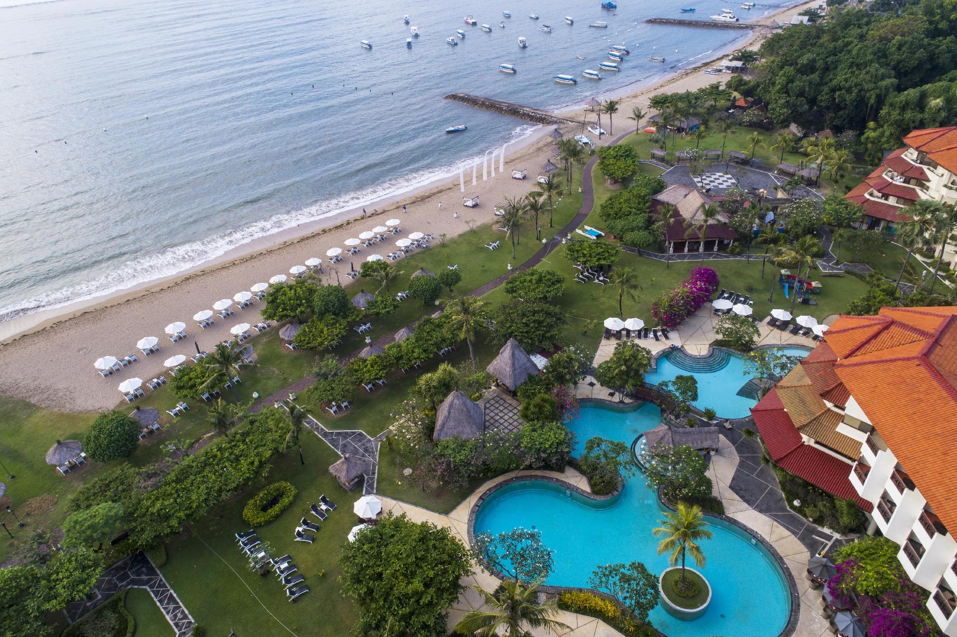 Luxusní plážový hotel s programem All Inclusive se nachází v tropické zahradě u pláže Tanjung Benoa. Ubytování v jednom z 301 pokojů s výhledem do zahrady nebo na bazén. Pokoje s výhledem na moře na vyžádání