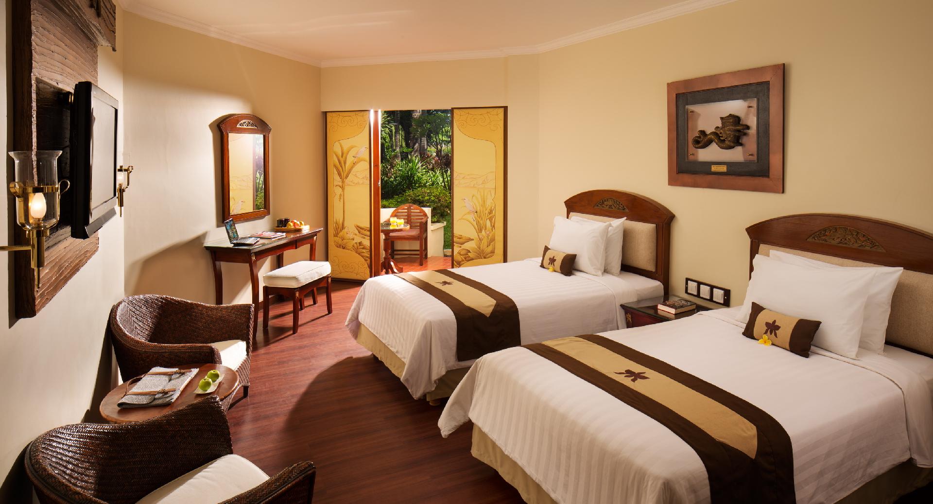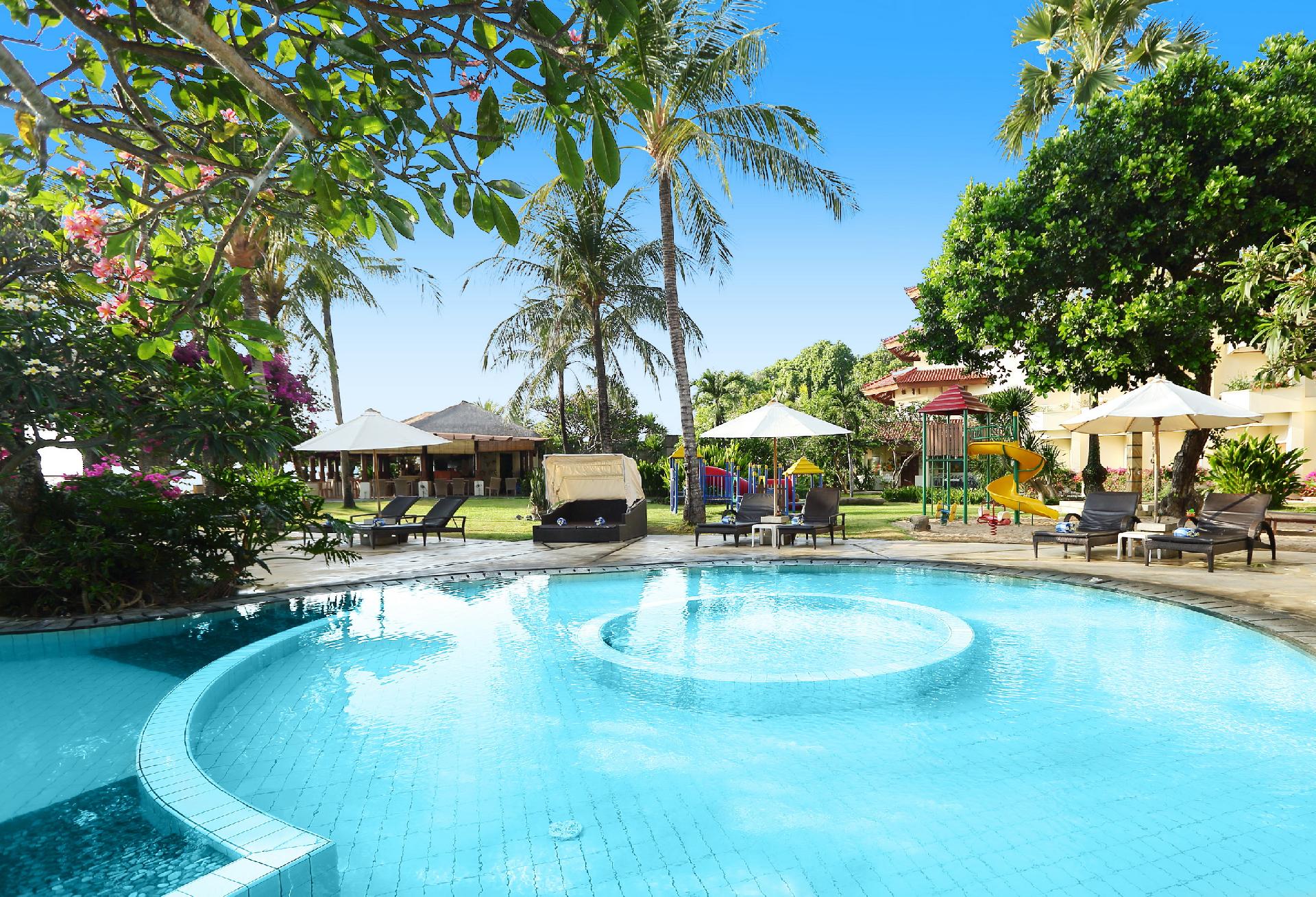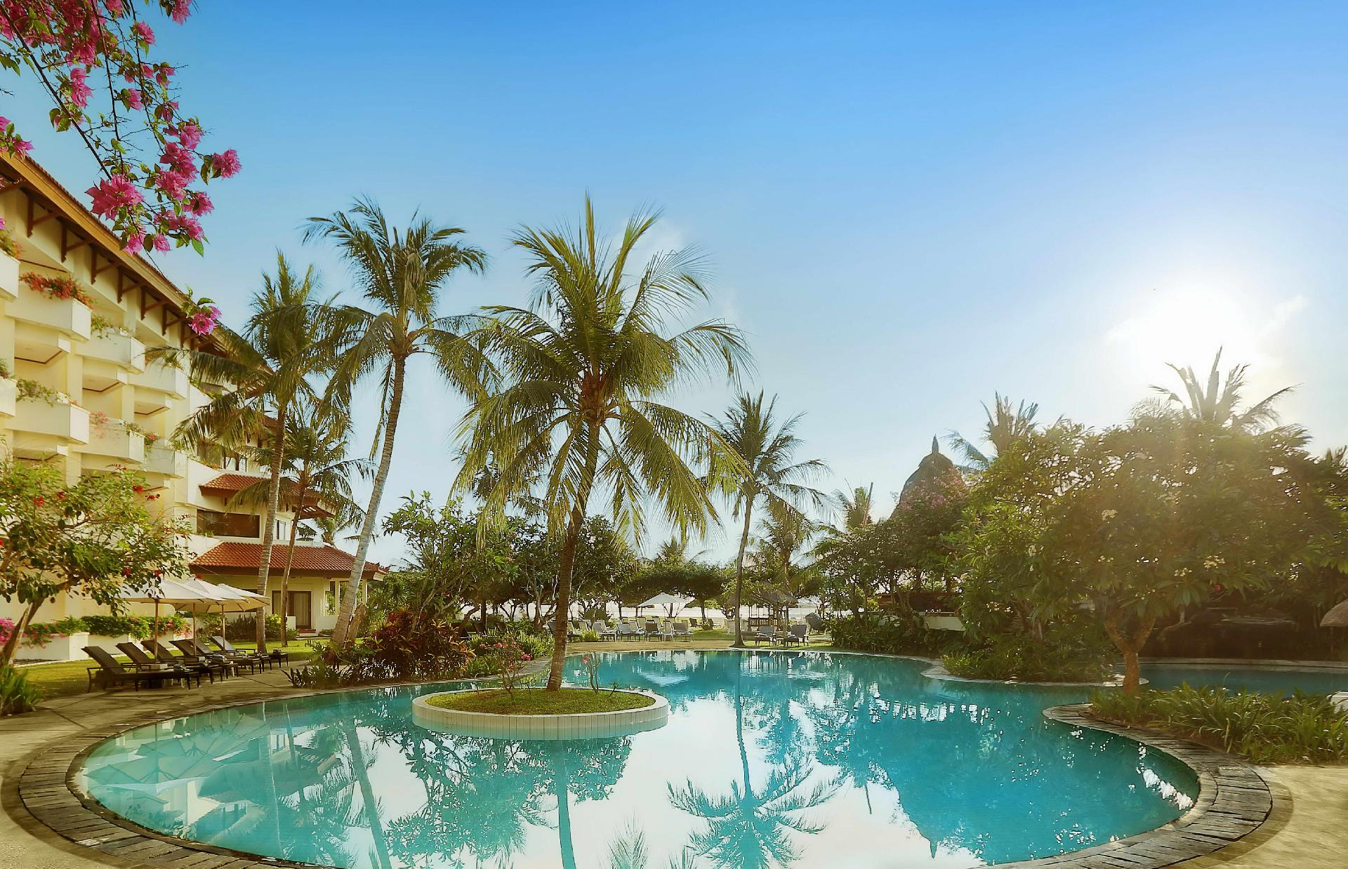 luxusní plážový hotel s programem All Inclusive se nachází v tropické zahradě u pláže Tanjung Benoa. Ubytování v jednom z 301 pokojů s výhledem do zahrady nebo na bazén. Pokoje s výhledem na moře na vyžádání.