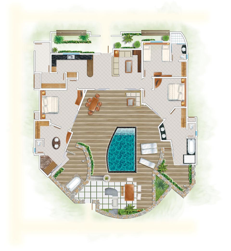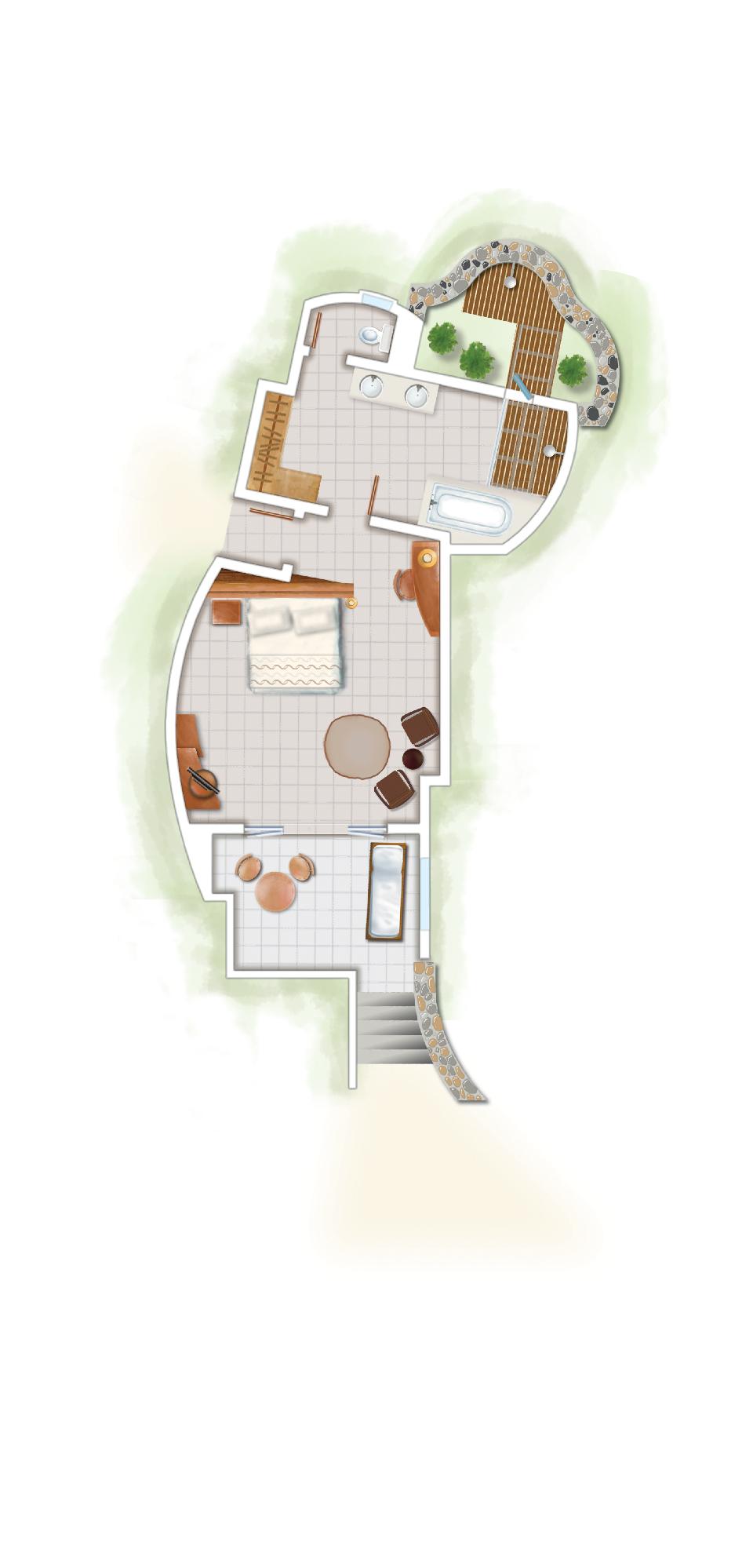 Tento apartmán perfektne kombinuje elegantný štýl s modernými a luxusnými prvkami. Je umiestnený len niekoľko krokov od pláže a disponuje vzdušnými otvorenými priestormi. Jeho súčasťou je veľká terasa a súkromný bazénik. Tropická kúpeľňa je vybavená vaňou a vonkajšie sprchou umiestnenou v záhrade. Ďalšie vybavenie zahŕňa klimatizáciu, satelitný TV, súpravu na žehlenie, zvukový systém, trezor, bezplatné Wi-Fi pripojenie, IP telefón, minibar, súpravu na prípravu čaju a kávy a kávovar Nespresso. Ubytovanie je možné pre 3 dospelé osoby a 1 dieťa do 2 rokov.