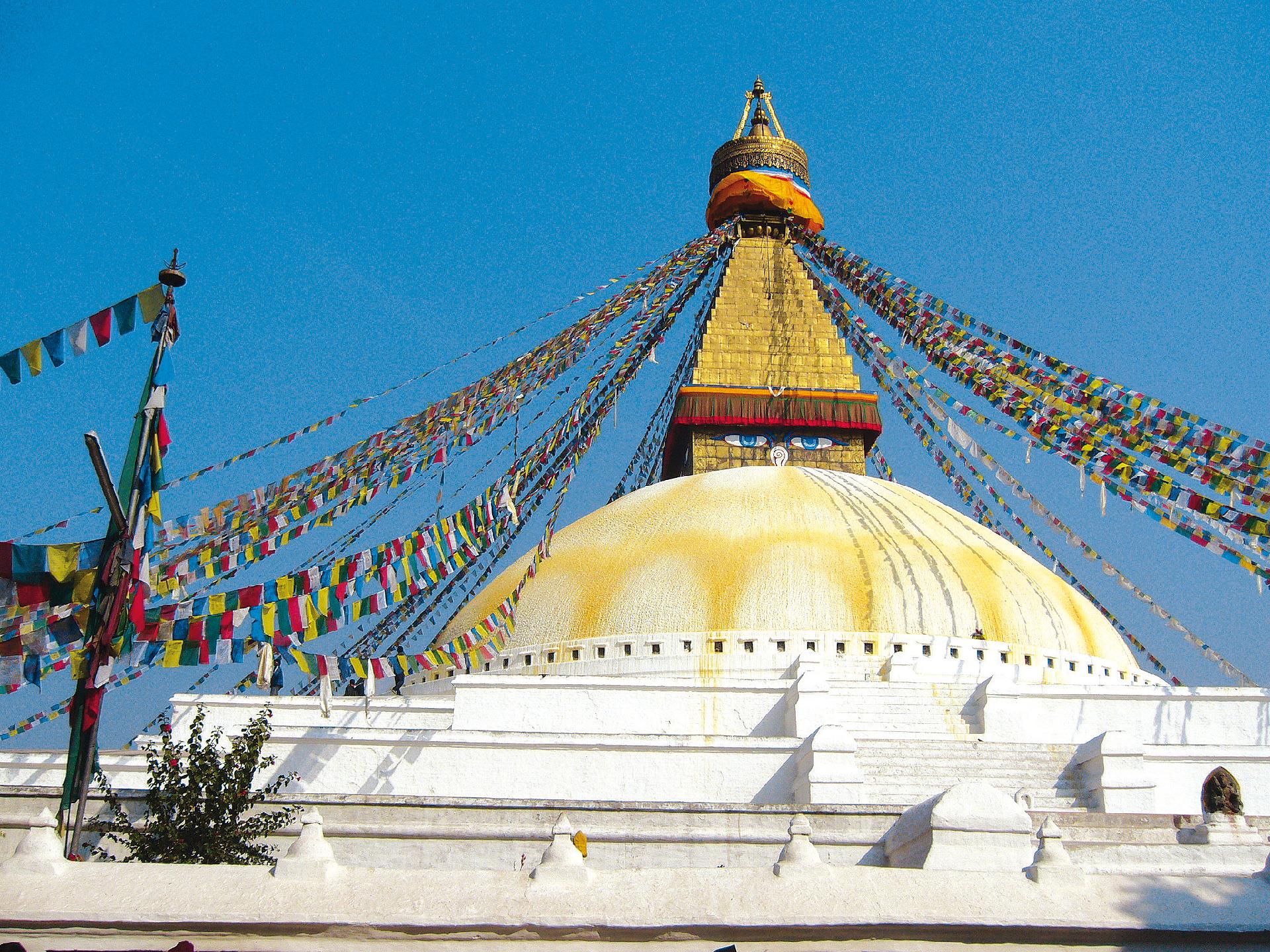 Přílet do Káthmándú. Následuje prohlídka centra Káthmándú včetně paláce Živoucí bohyně Kumarí Dévi, sochy hrozivého vtělení boha Šivy Kala Bhairab a chrámu Swayambhunáth na pahorku nad městem, odkud se otevírá nádherný výhled na káthmándské údolí. Odpoledne prohlídka tajemného chrámu Pashupatinath zasvěceného bohu Šivovi. Chrám patří k jednomu z nejdůležitějších náboženských míst v Asii pro Šivovy uctívače. Provádějí se zde kremace a poslední obřady hinduistů. Následuje návštěva Boudhanáth stúpy – největší kulové stúpy v Nepálu. Obě pamětihodnosti jsou zapsány na seznam světového kulturního dědictví UNESCO. Transfer do hotelu. Ubytování a nocleh v Káthmándú.