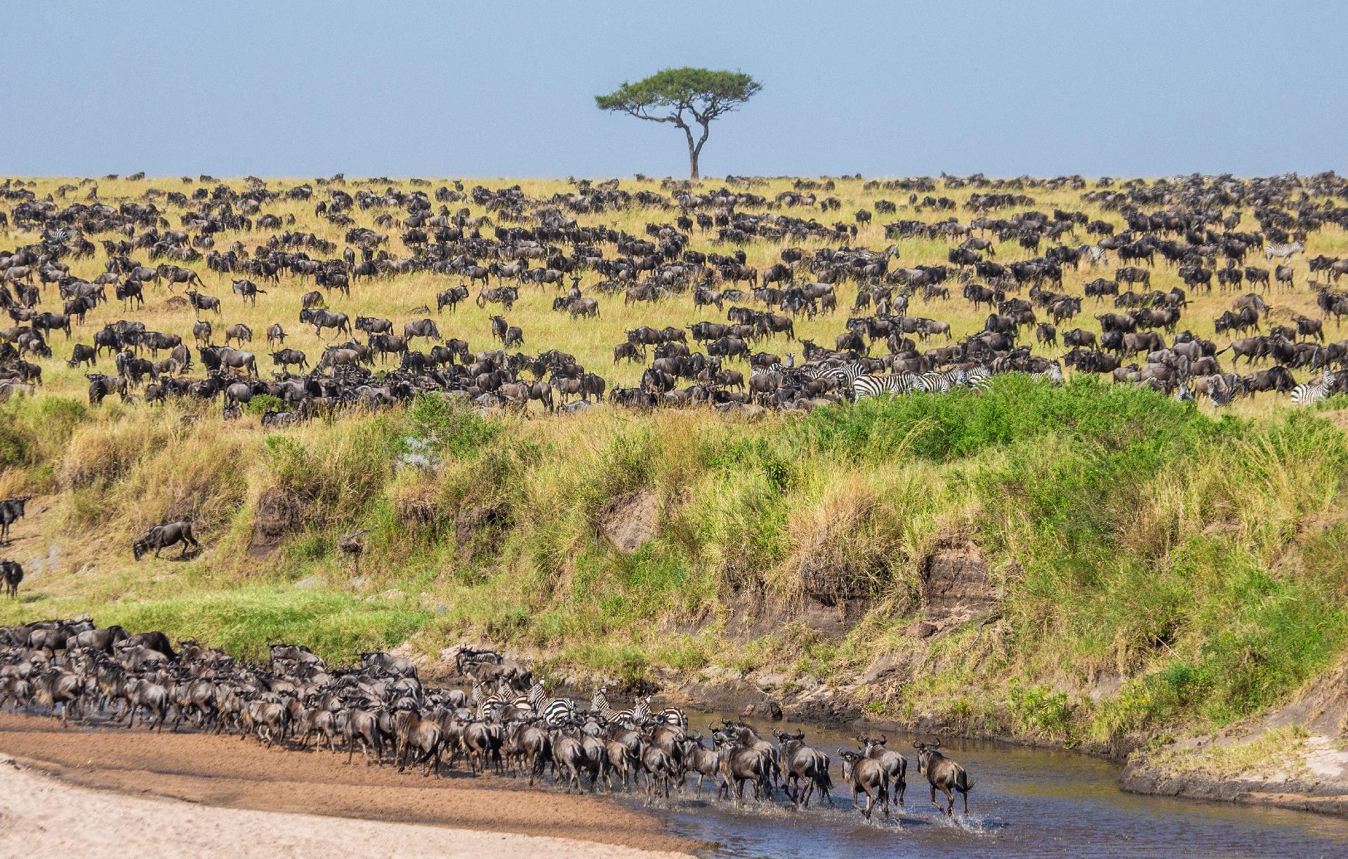 Porodní exploze na pláních Ndutu - obrovská stáda pakoňů čelí nájezdům číhajících šelem. Nezapomenutelné putování tanzanskými rezervacemi s důrazem na únorovou migraci pakoňů a zeber.